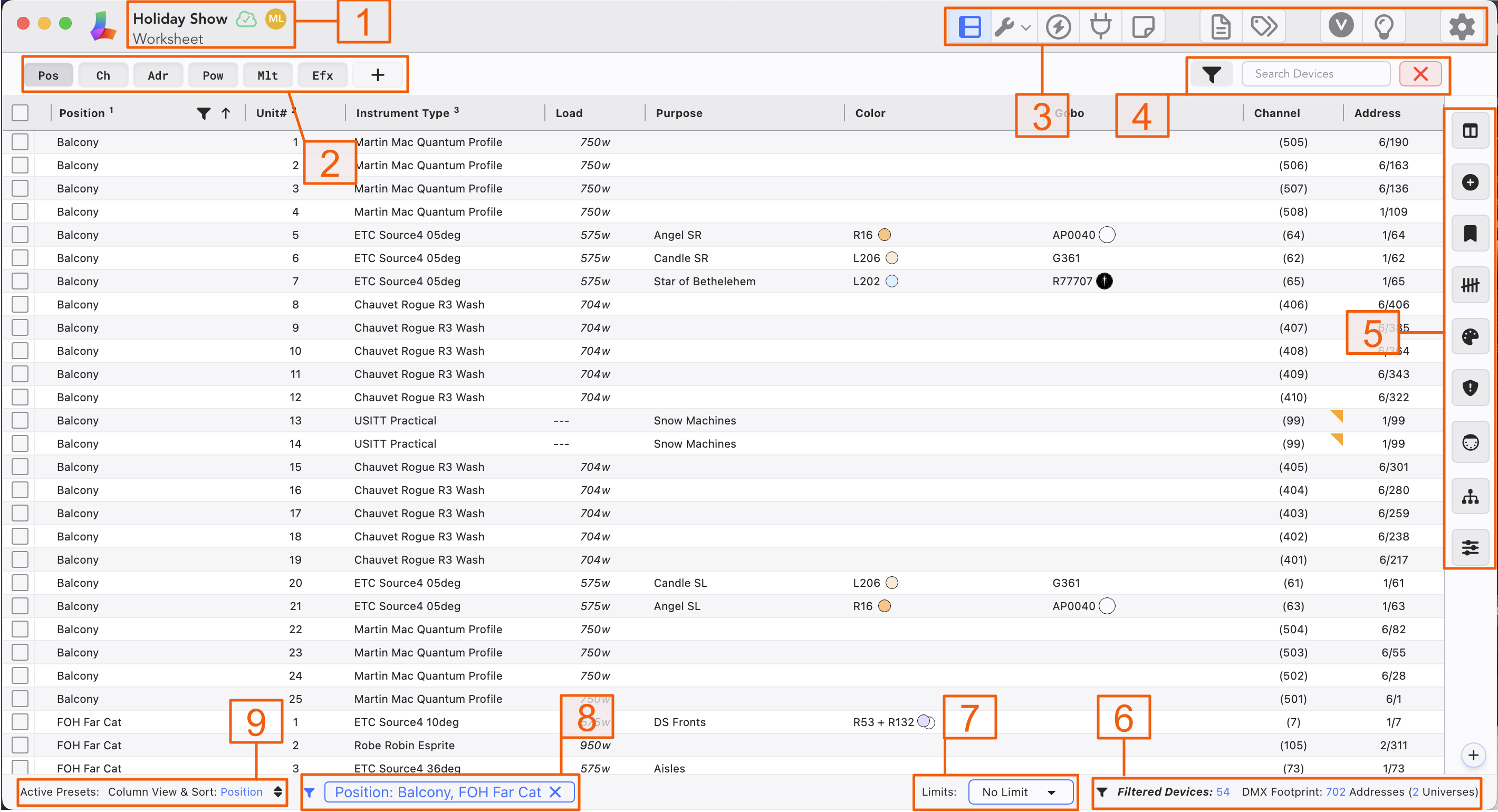 Summary-- a place that displays helpful Counts for your worksheet. In the case of DMX Footprint, this can be displayed in Normal and grandMA parameter count (selectable in Setup>Show Preferences).