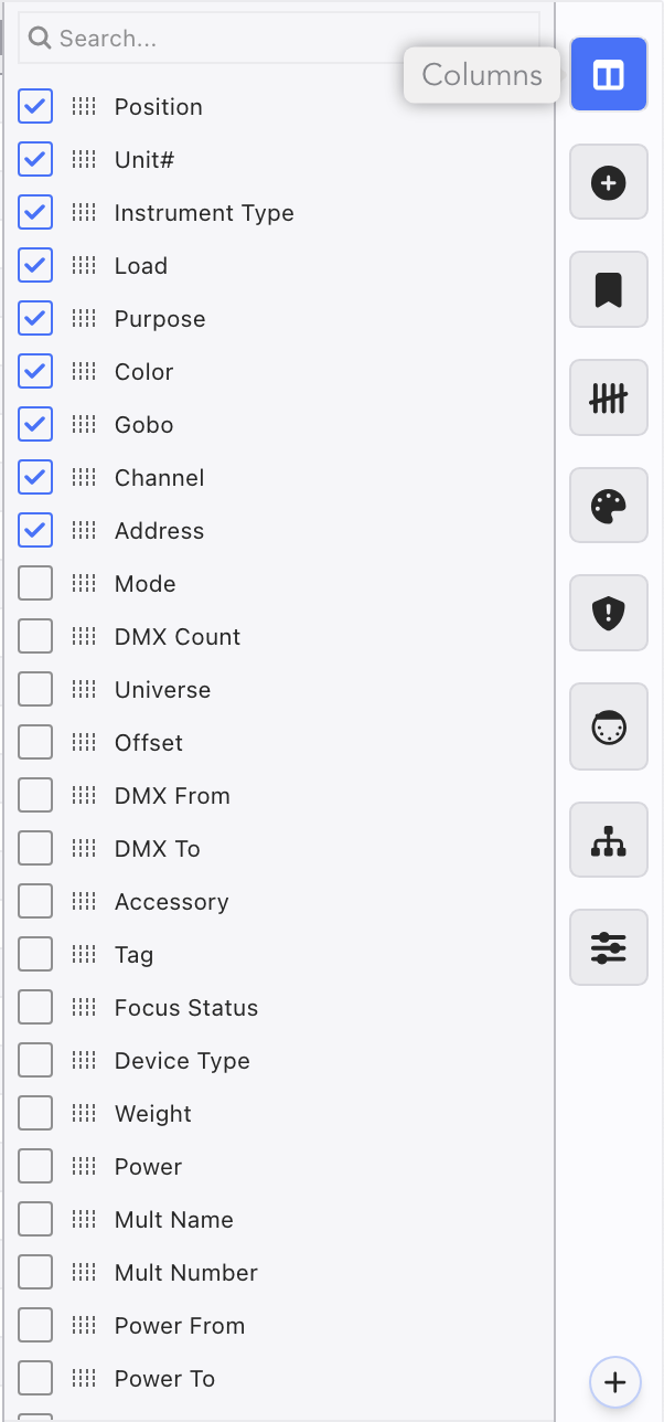 To control what Columns are viewed in the Worksheet, touch the Columns side tab. All Columns with content or without will be here to include or exclude.