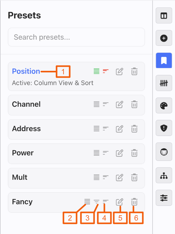 Presets at first appear to be simply a "sort-by" function, but they have more options. The default Presets are sorted by Position (per the Position Directory order), Channel, Address, Power and Mult (per the Cables Directory order). They also store the visible Columns.