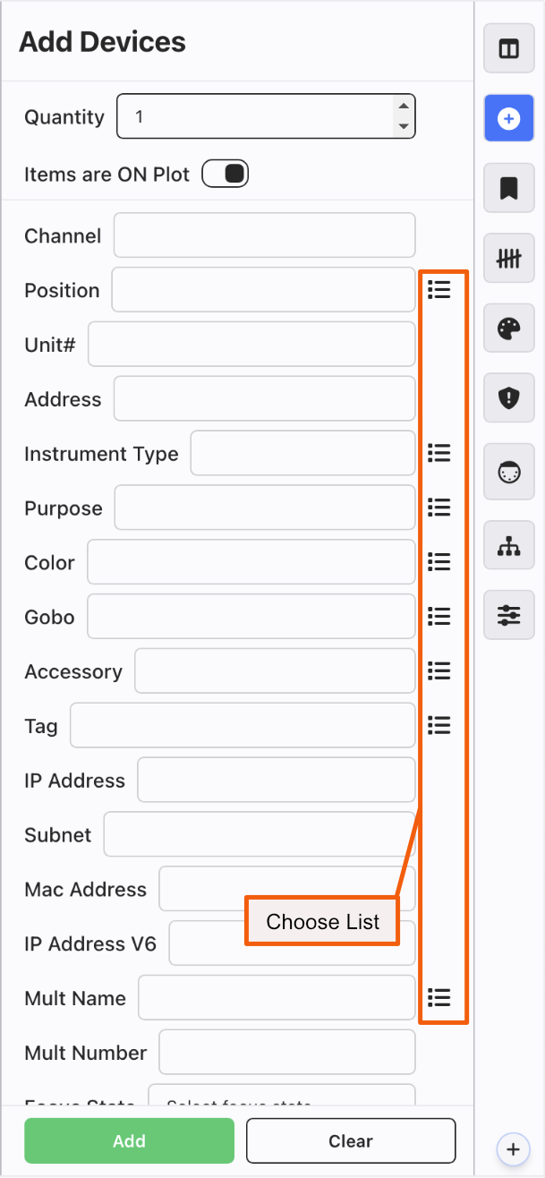 Pressing the icons on the right trigger the Choose List function, which allows you to select data from your show file for consistency and ease.
