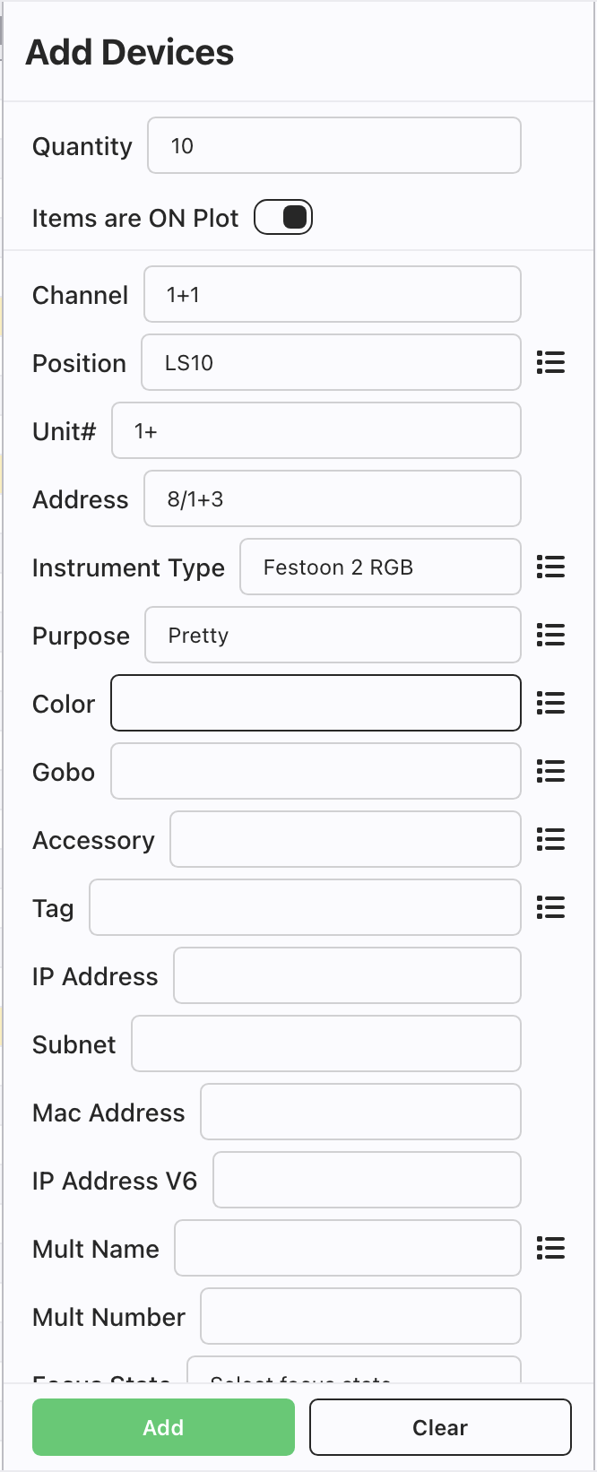 Clear: Press to empty your fields. Helpful if you already input one position of Devices and wish to continue adding.