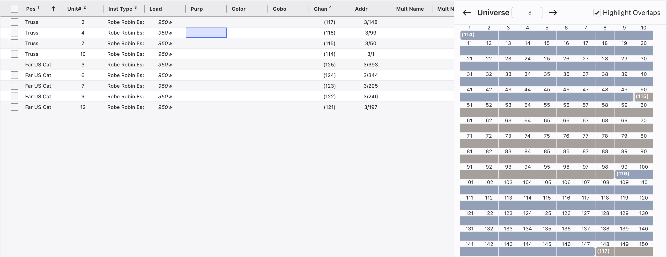 As you arrow through your Universes, the Worksheet is filtered to only show the fixtures in that Universe.