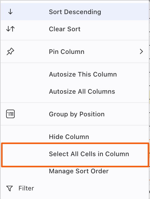 Sometimes it's helpful to select the contents of a column. This is easily done by pressing Alt/Option+ clicking or right-clicking the header and choosing Select All Cells in Column from the popup menu.