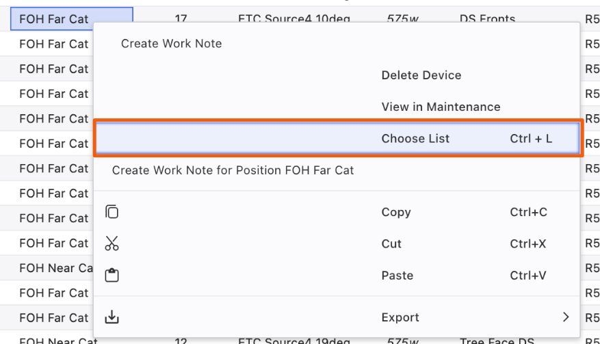 There are times it's easier and more precise to add or replace data by choosing from items already in your show file. This is easily done with the Choose List option.