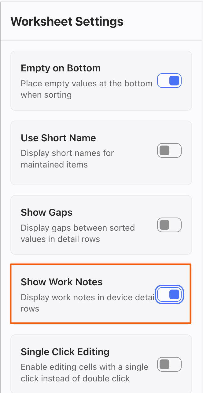 in the Worksheet to display your work notes. Turn on Work Notes with the toggle.