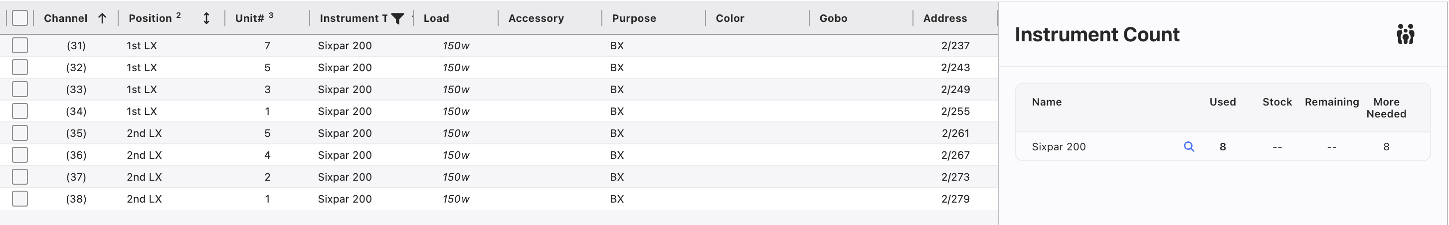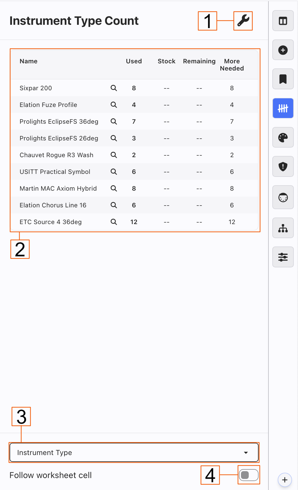 Example: Touching any Magnifying Glass for an Instrument Type filters your Worksheet to show you those lights instantly.