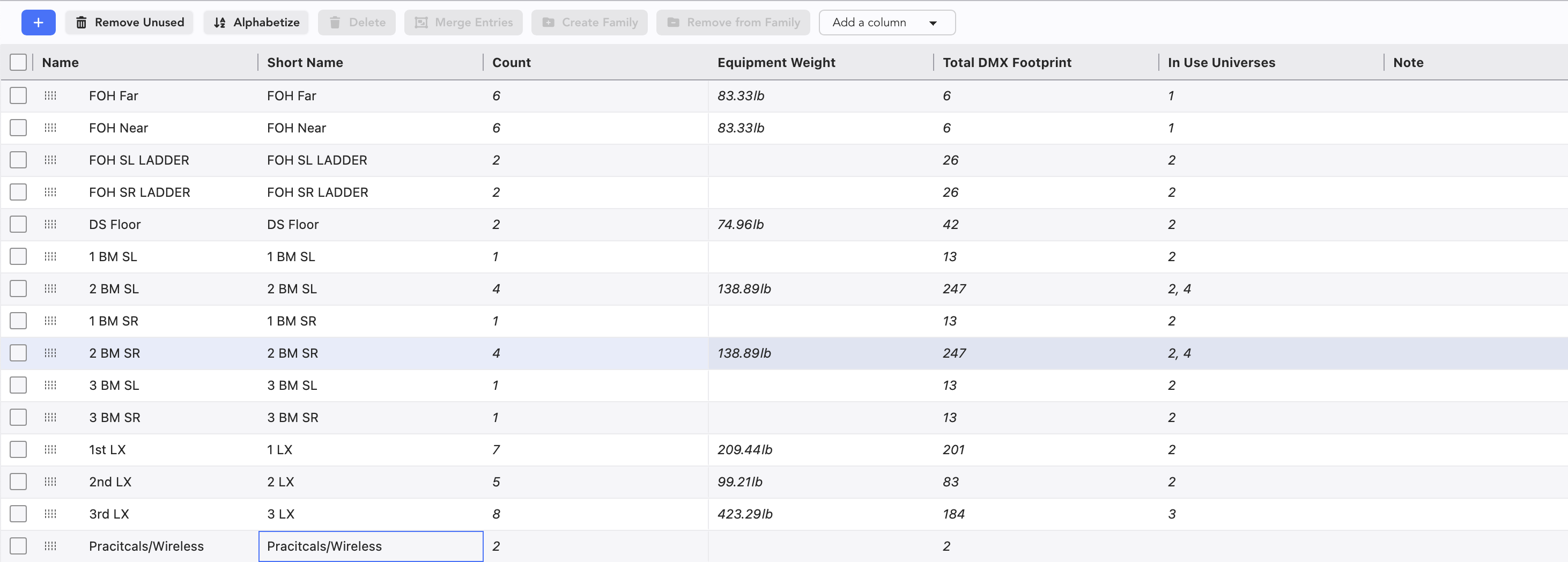 Just like in all Maintenance categories, you can drag to reorder Positions, rename, Merge Entries, Create Families, etc. Notice the Equipment Weight by position data as well as Total DMX Footprint and In Use Universes.