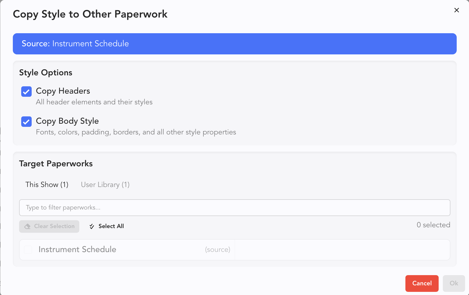 Copy Style to Others opens a popup. Select what you wish to copy over and the destination and press Ok.