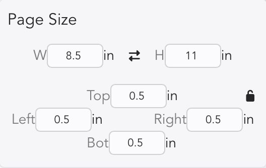 - Page Size button toggles a popup where you can view or edit your page. The lock icon prevents accidental changes.