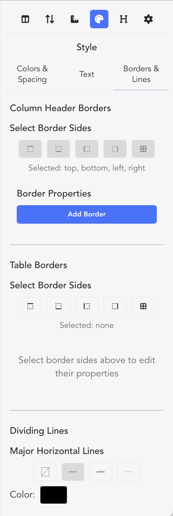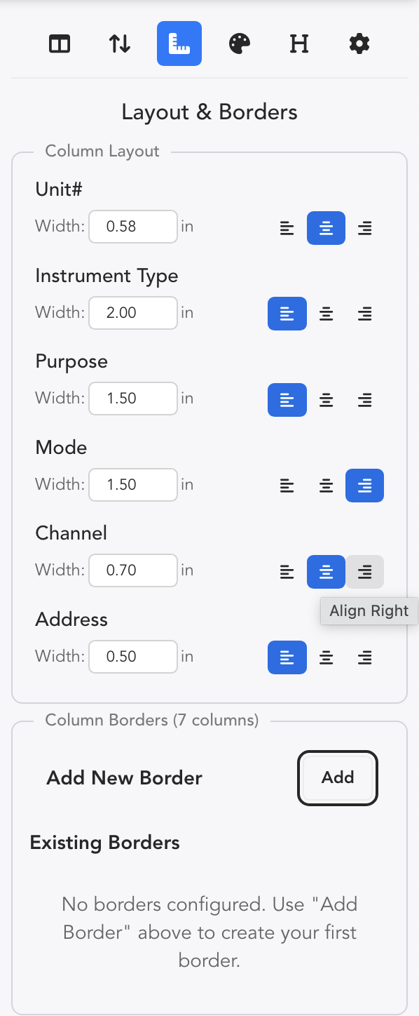 - Add New Border opens a window that allows you to add vertical dividing lines between Columns of your choosing.