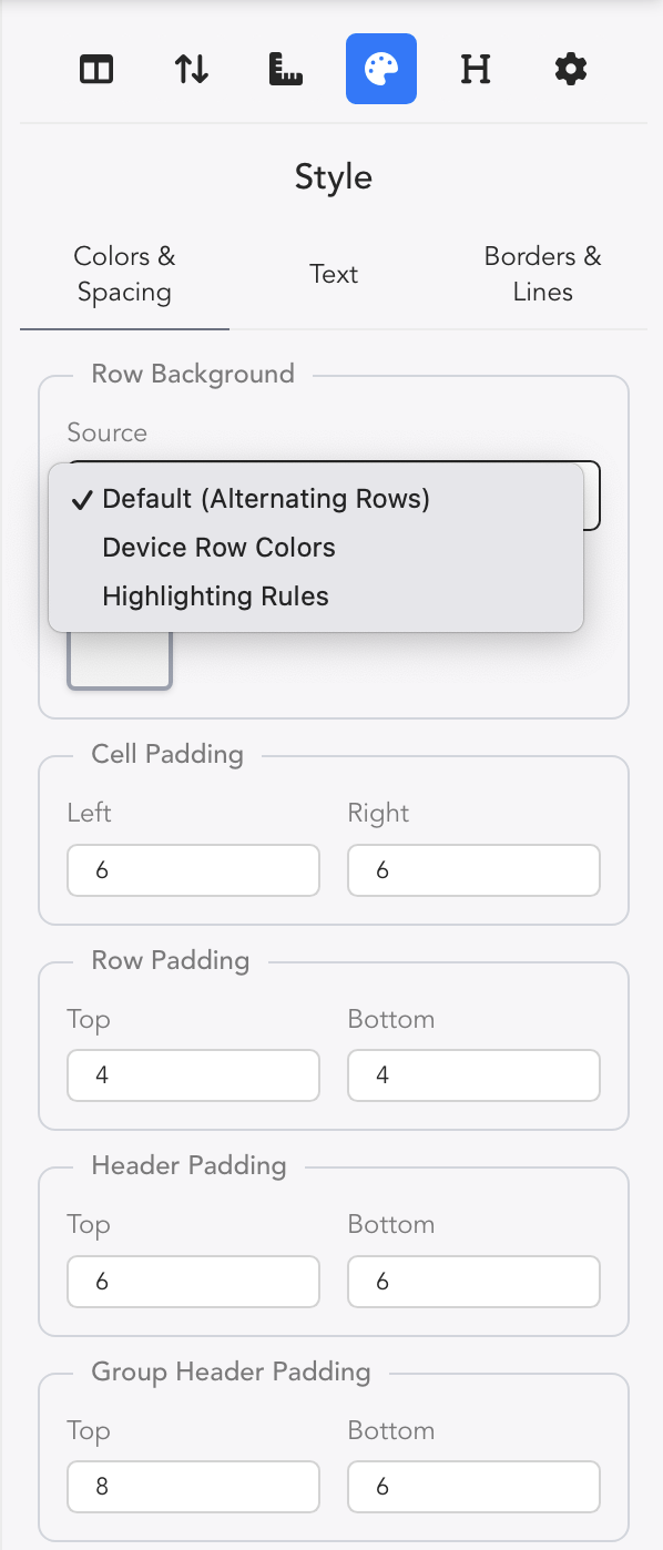 While you can choose a general color background for Alternating Rows, you can also choose to make use of your Device Row Colors or Highlighting Rules when formatting your paperwork.