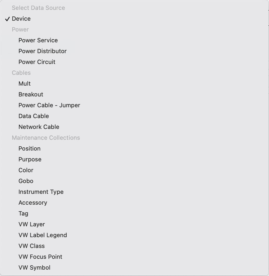 Data Source-- most labels are device labels (Fixtures, Gateways, etc.) But labels for your cables or Power distros, for example, would need to pull from different parts of your Lightwright file. You choose that here.