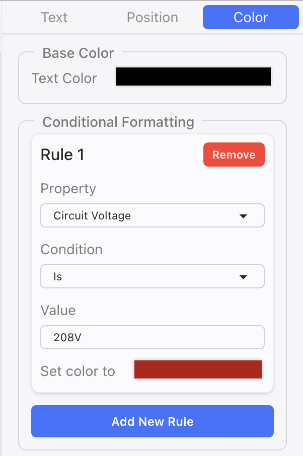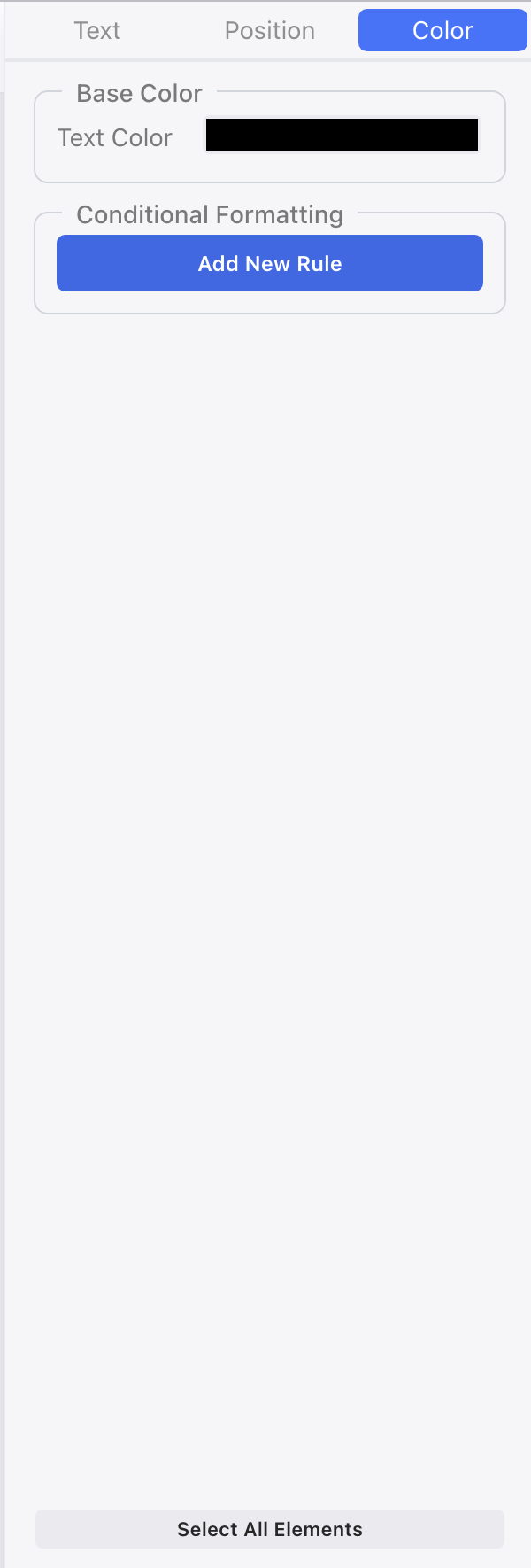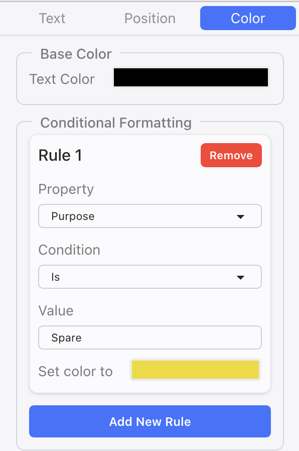 - Conditional Formatting- a series of rules you can input to have certain conditions result in certain colors. Can be for Text or Rectangle objects. Here are two examples of conditional formatting: