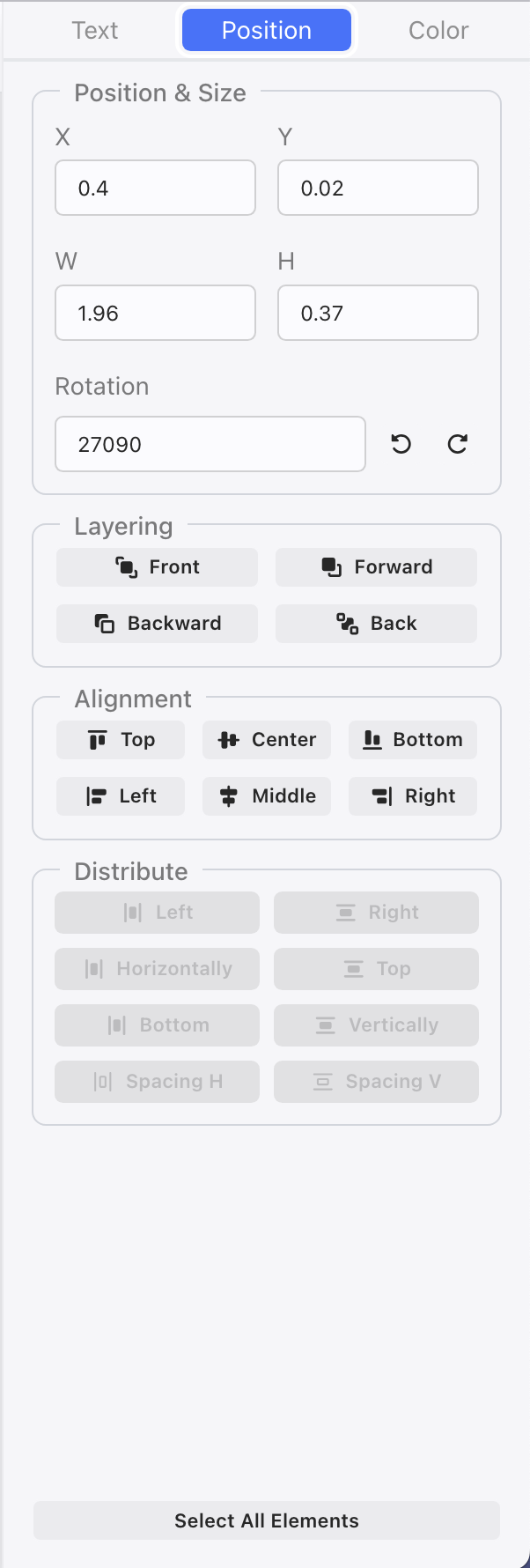 Tabs for the selected Text, Rectangle or Image. Constant tabs are Position and Color. Text and Image appear as tabs when you are selected on the respective field.