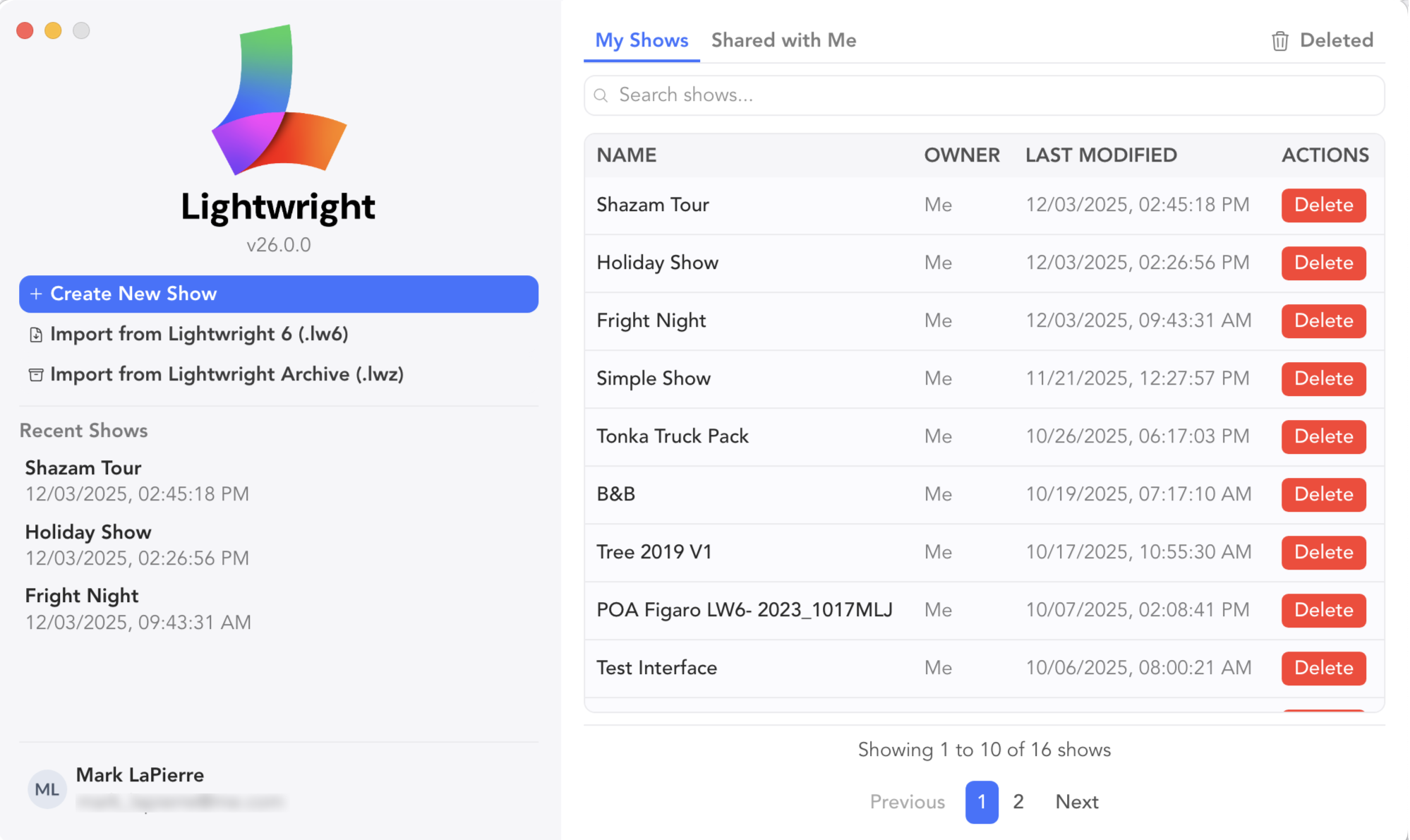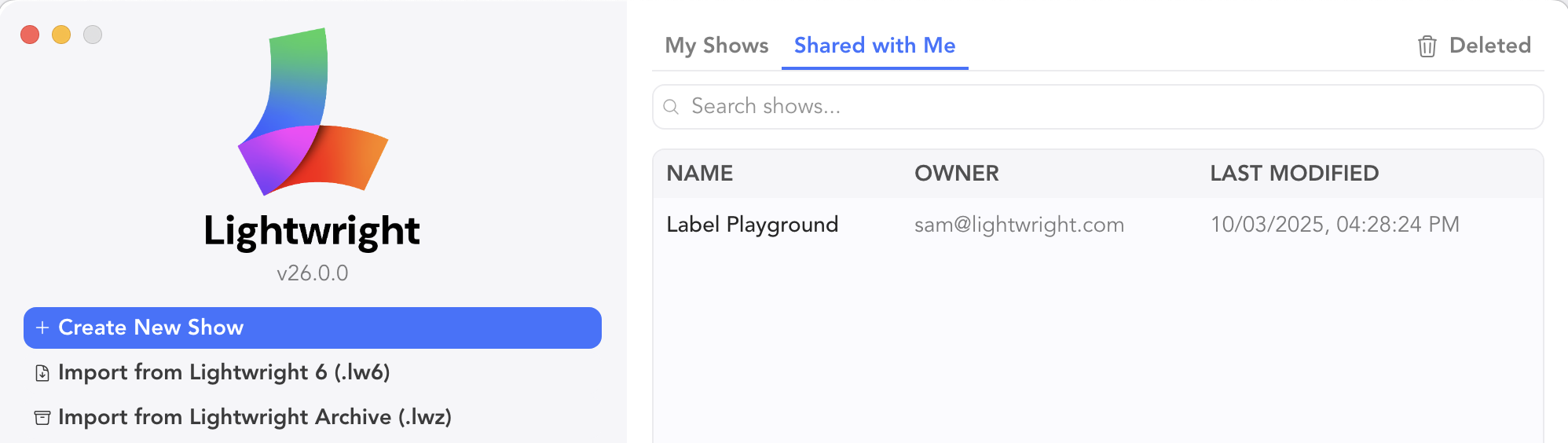 On the right are all of your show files, in order of how recently you opened them. Open any of them with a single click.