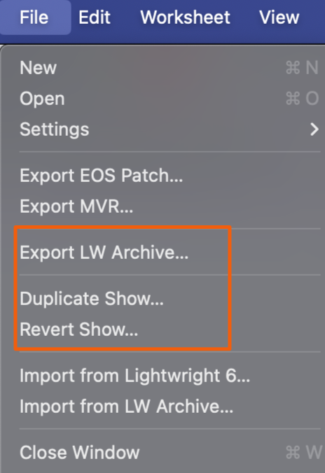 Certain core Show File Management options only exist once you've opened a show and go to File.