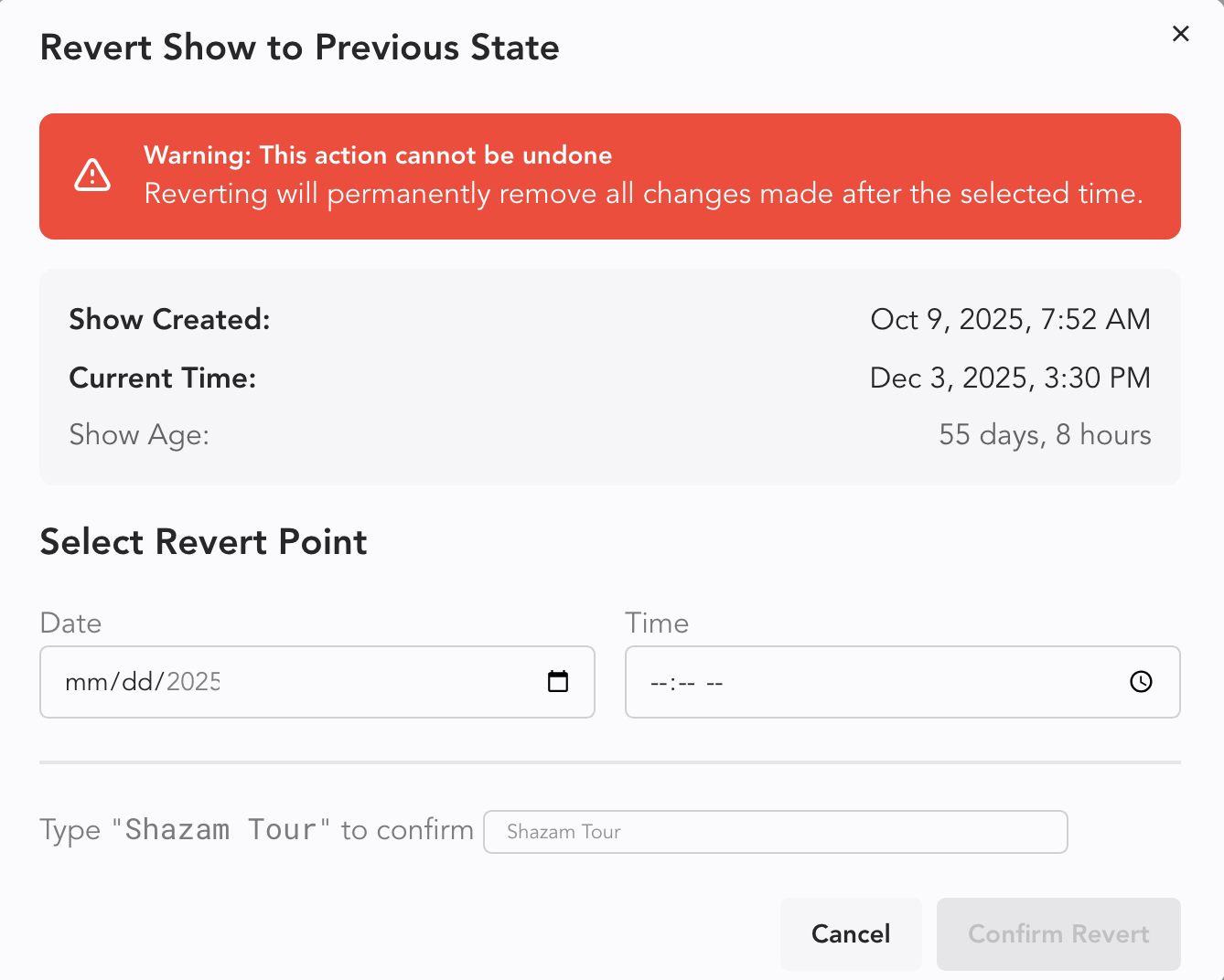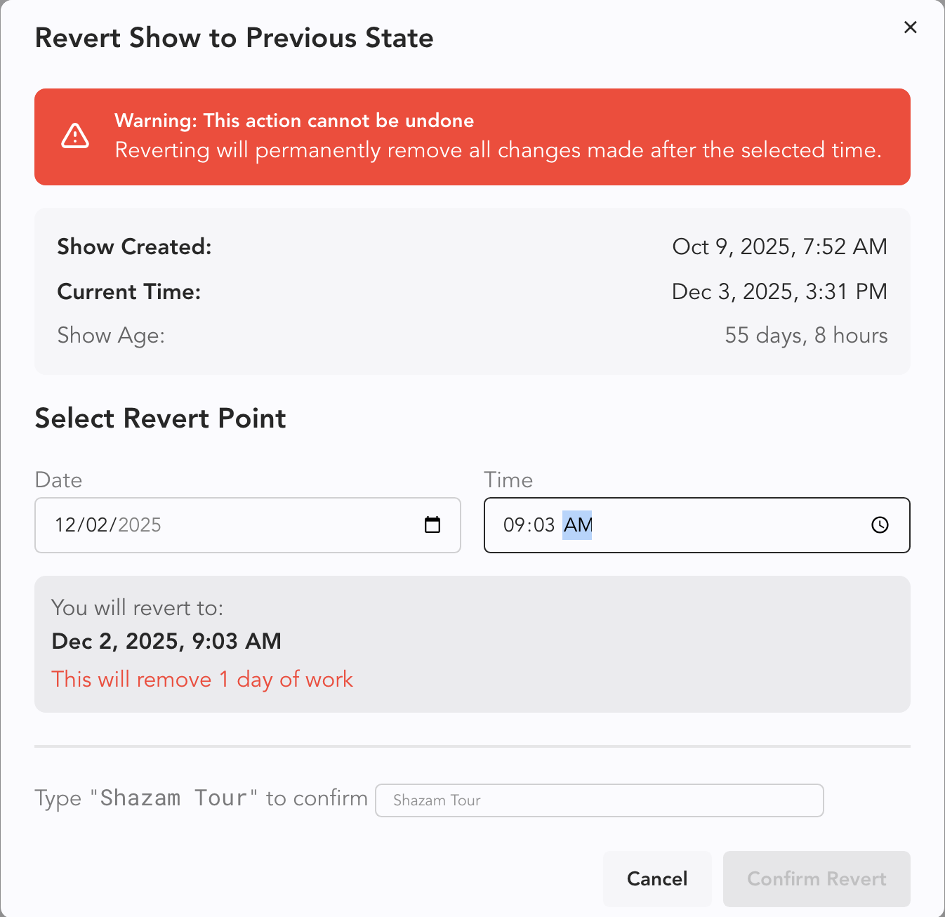 Lightwright autosaves iterations of your show file with every action. You can roll back to literally any time/date at any time. This will revert all contributions from all Collaborators across all categories of data that can be stored in LW. To revert, navigate to File>Revert Show. A popup opens.