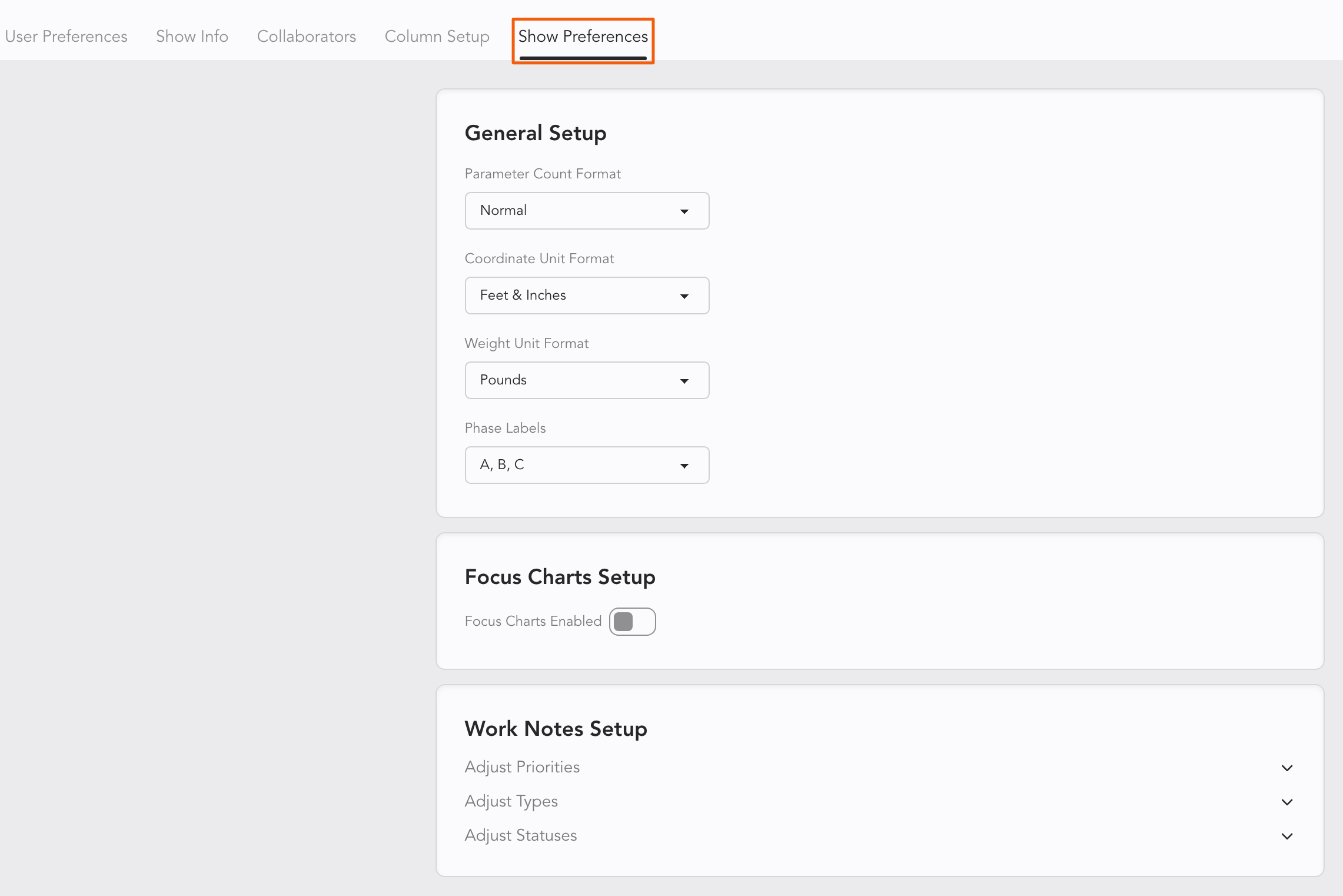 Focus Charts Setup-- this must be turned on to use Focus Charts. When toggled, there is a requirement to add an image that will serve as your groundplan in your Focus Charts. Touch Update Default Background to start with Focus Charts. File Requirements: Lightwright supports PNG, JPG, WEBP, BMP, GIF, TIFF. All images will be resized by Lightwright to have a max long dimension of 2048, and a max size of 5MB.