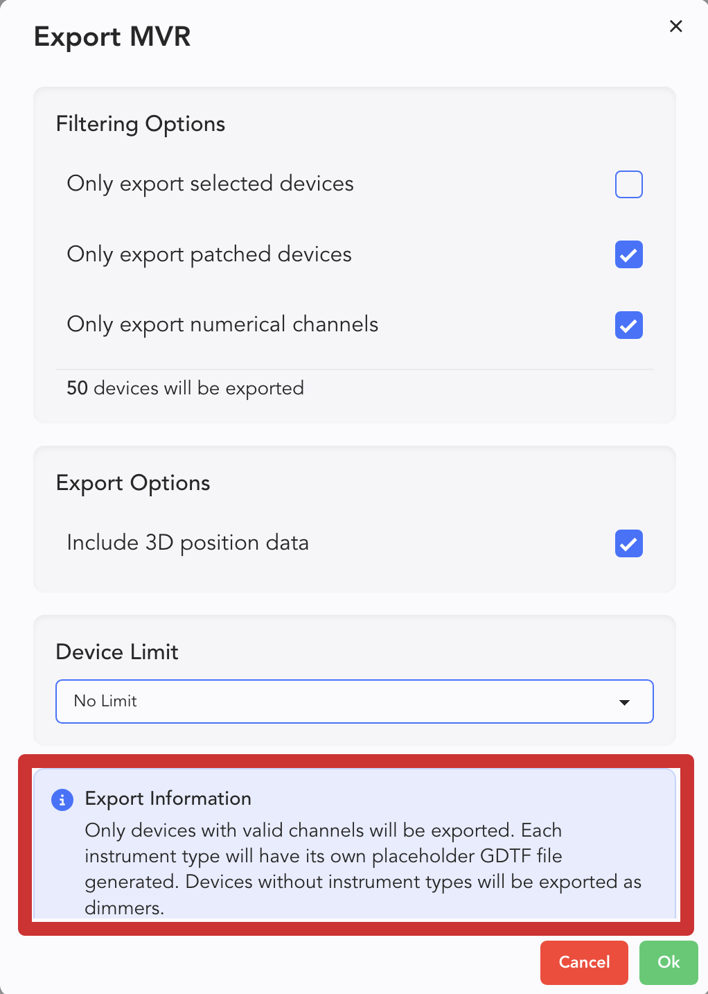 Only devices with valid channels will be exported. Each instrument type will have its own placeholder GDTF file generated. Devices without instrument types will be exported as dimmers. This means any instrument you import into another platform will need to have their fixtures remapped, as LW doesn't export actual fixture profiles.