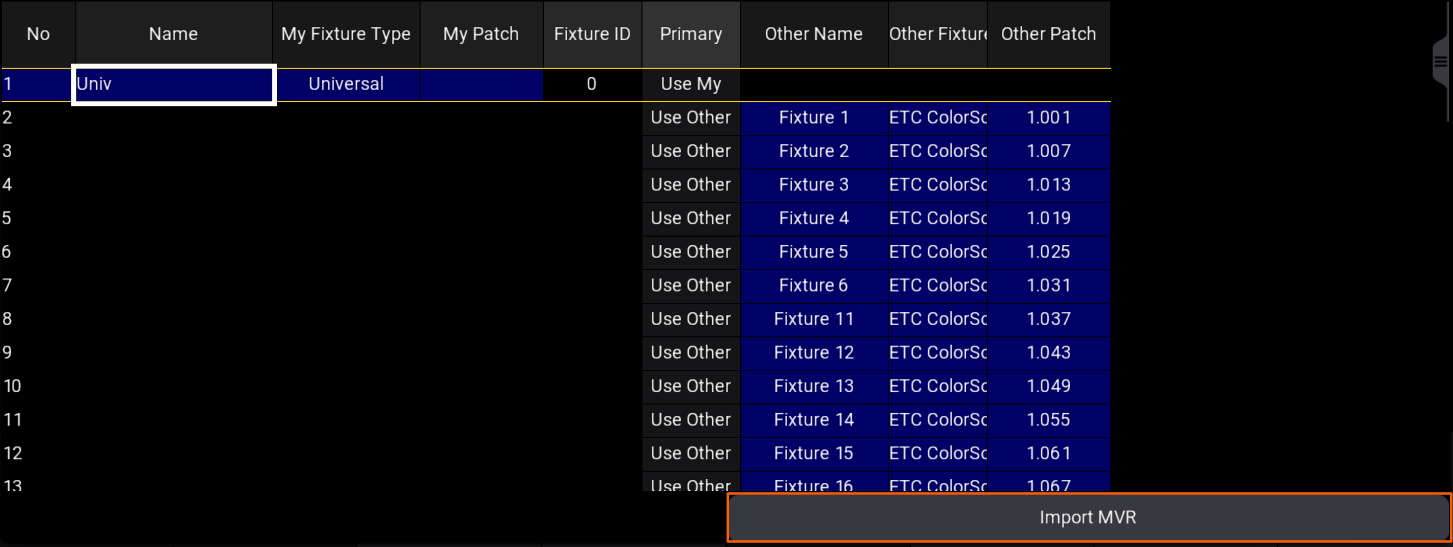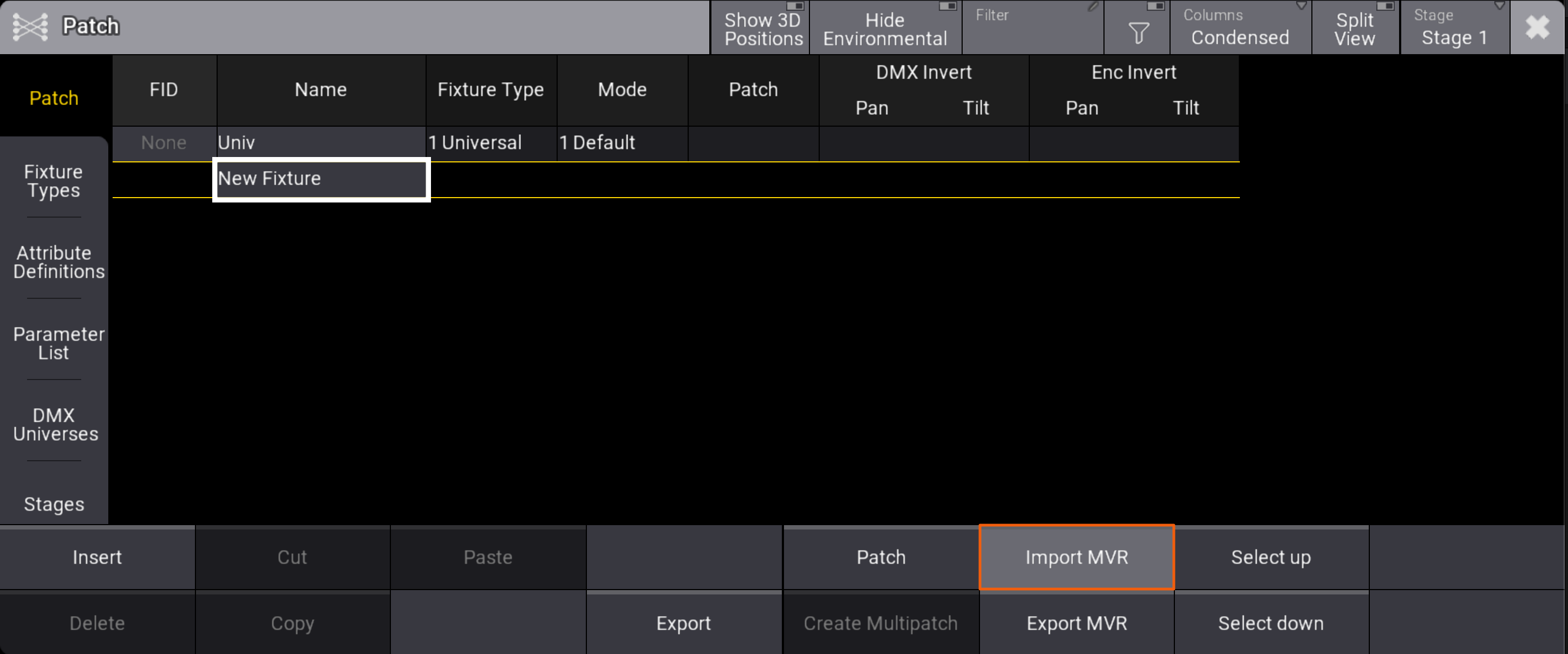 Open MA3 and go to Patch. Touch Import MVR.