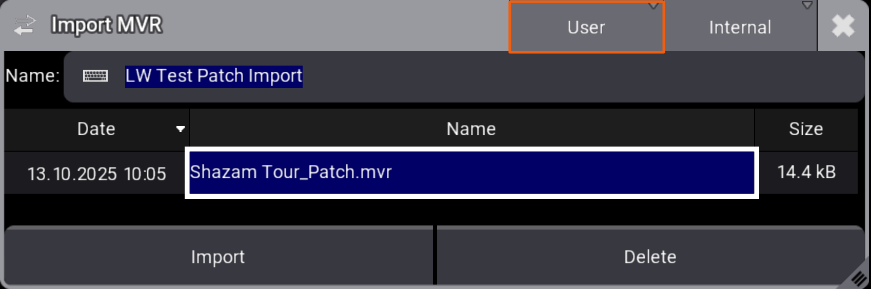 Direct MA3 to your file. If you don't see it, make sure you are set to User, not Demo. Also make sure you are set to Internal or External, as appropriate. Touch Import to confirm.