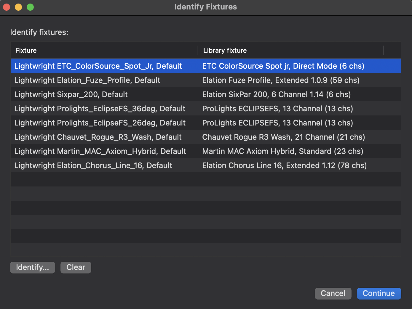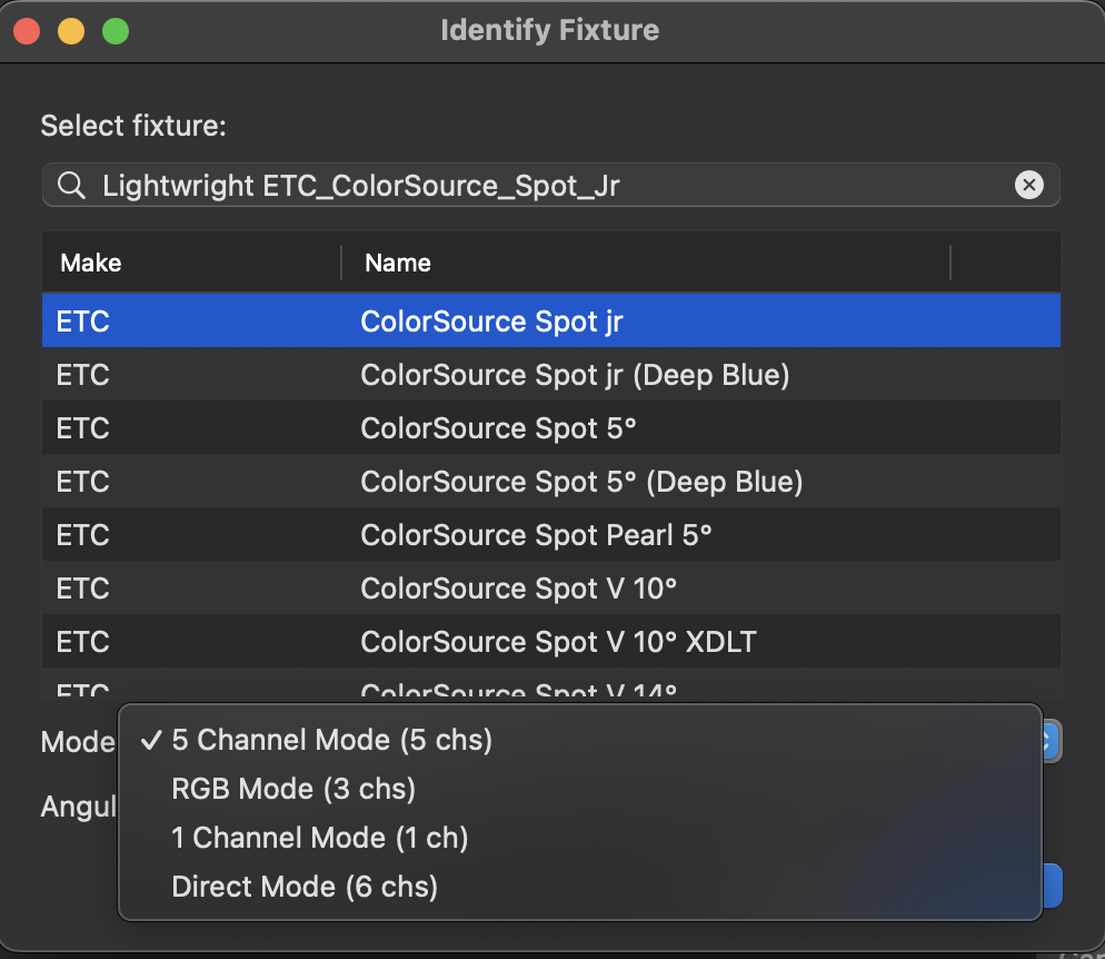 Select the fixture, then at the bottom, there is a pull down menu to select the correct profile/mode. When you are finished, click Continue.