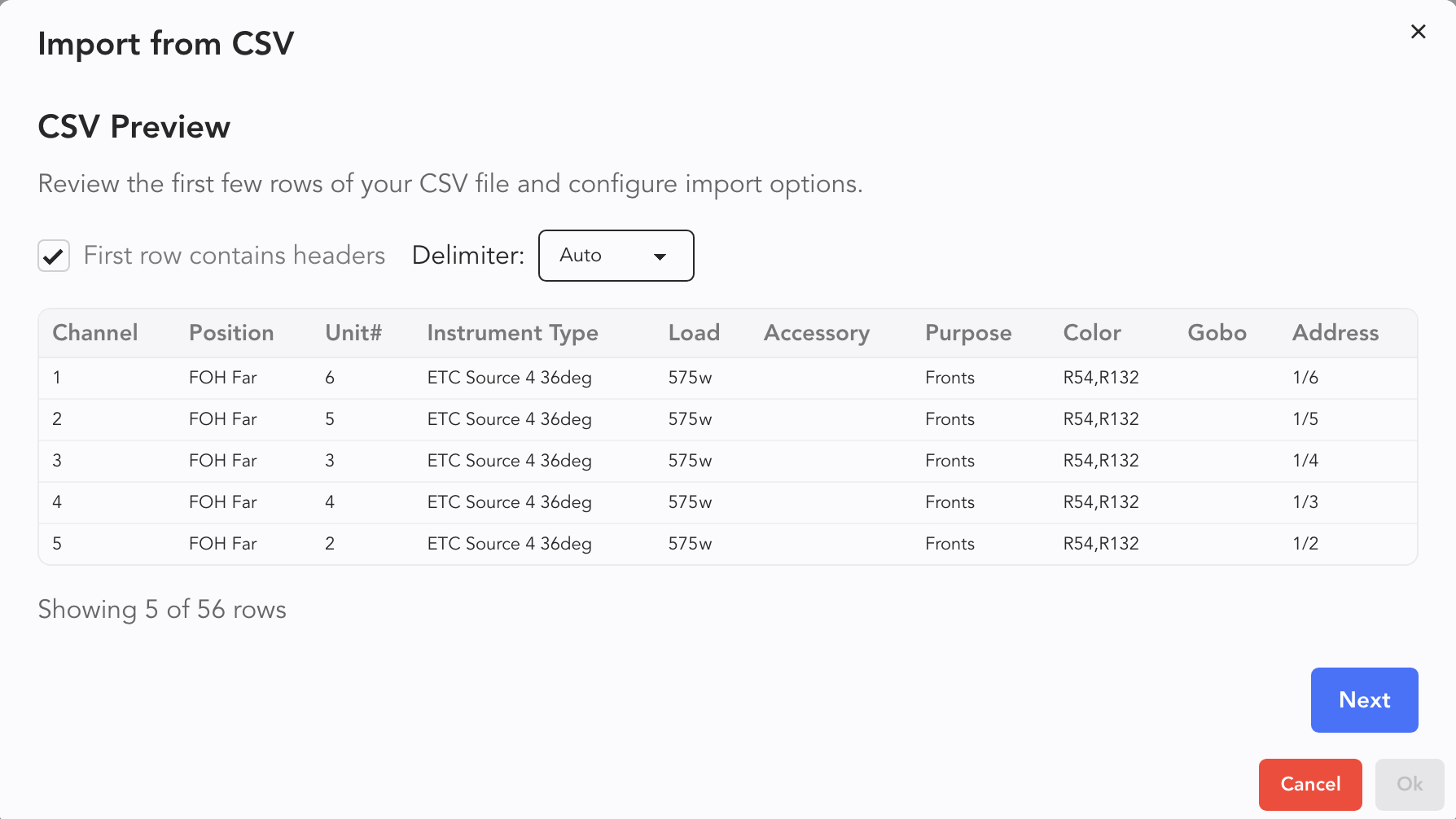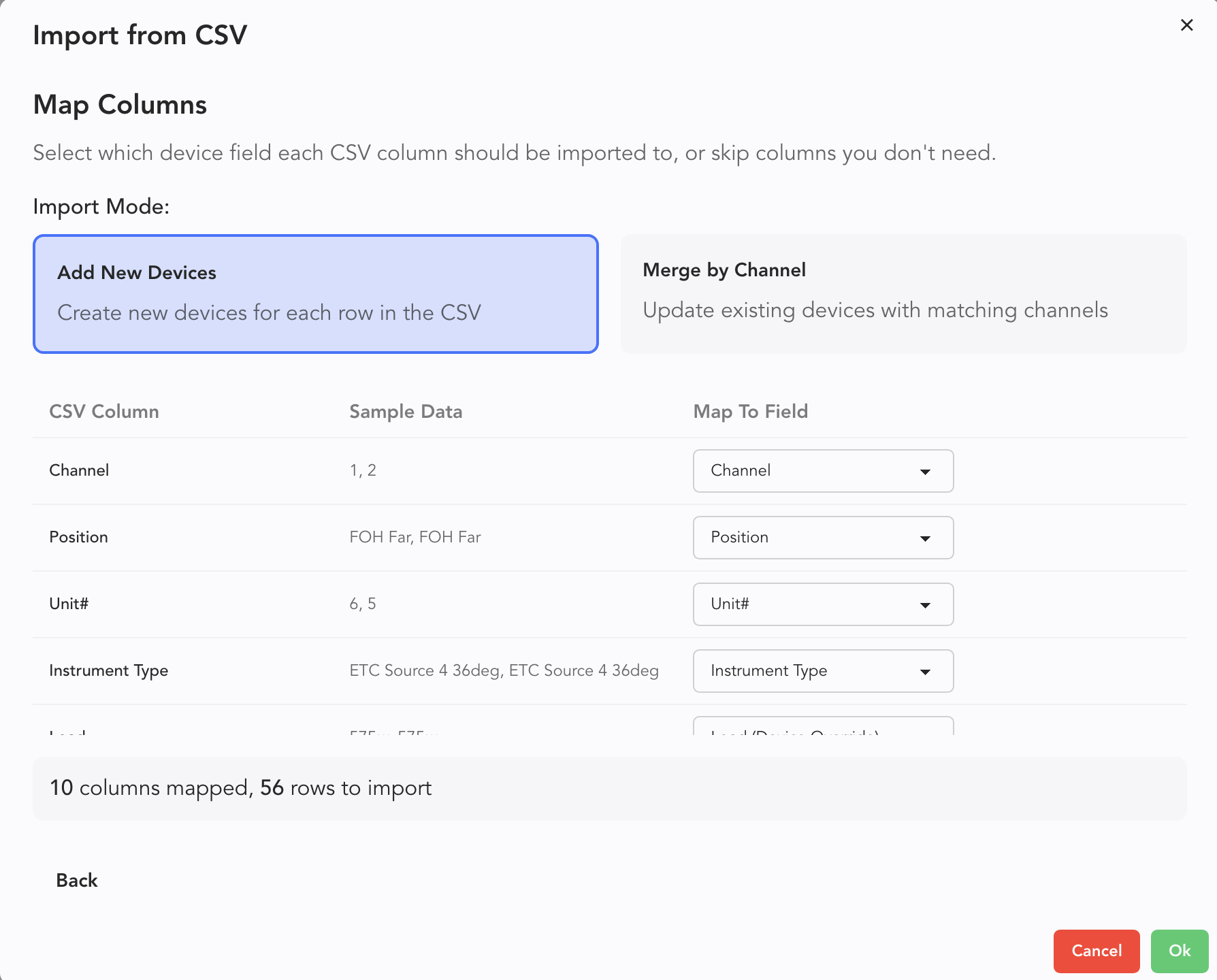 This next popup is where you choose between Add New Devices (which is the choice for this currently-empty file) and Merge by Channel-- which is better for merging data. You can also map fields to Lightwright Columns. When you have made your decisions, press Ok. Lightwright imports all the data.
