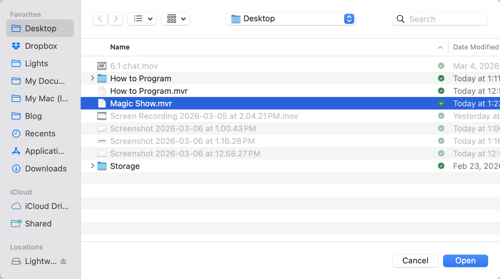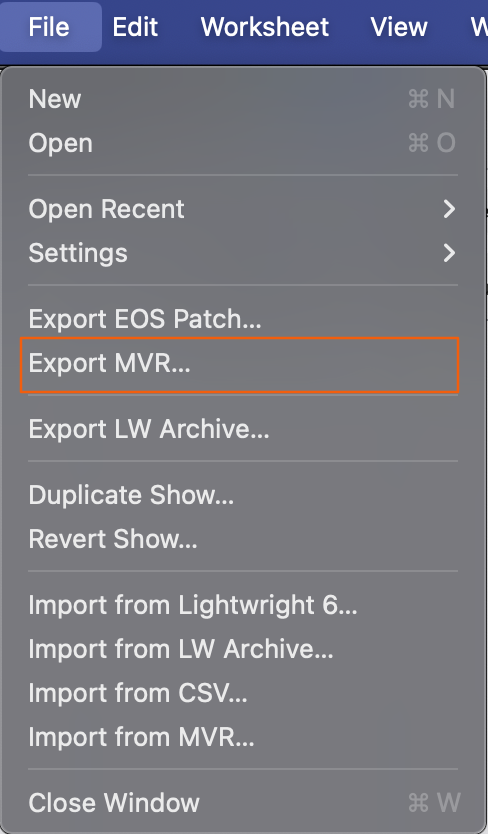 MVR is a significant tool for inter-operability. Lightwright supports both Import From and Export To. Let's Import. Start with your MVR file someplace easy to find like the Desktop of your computer. In a New File, go to File>Import MVR.