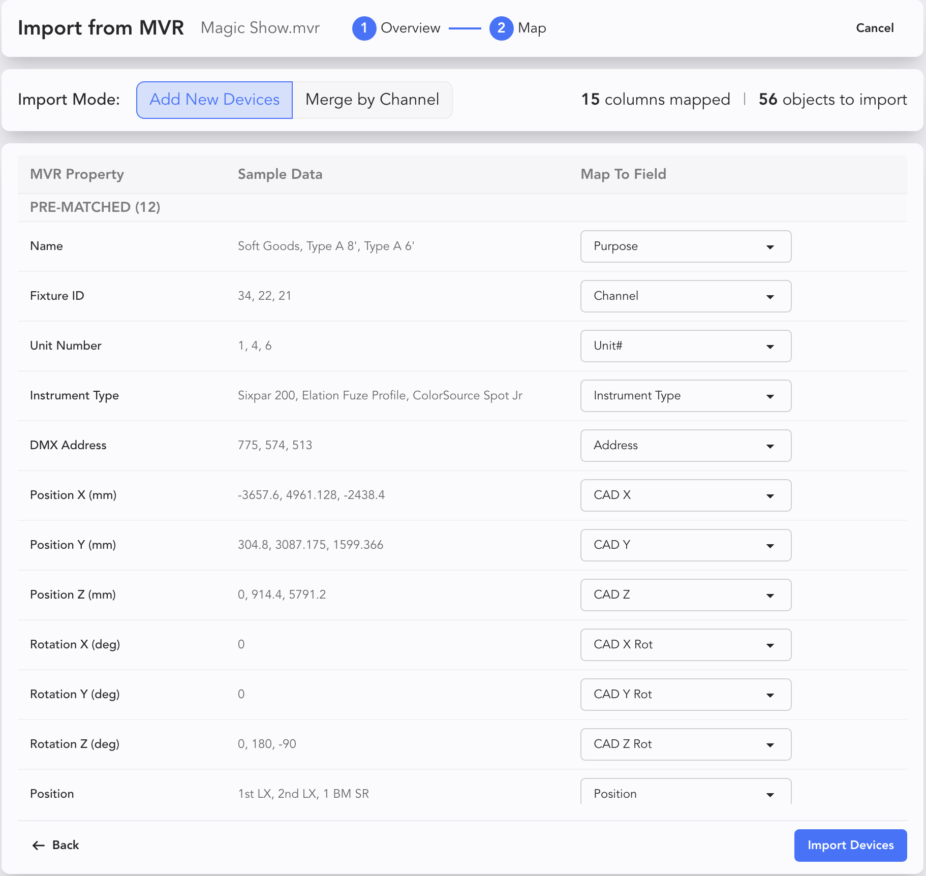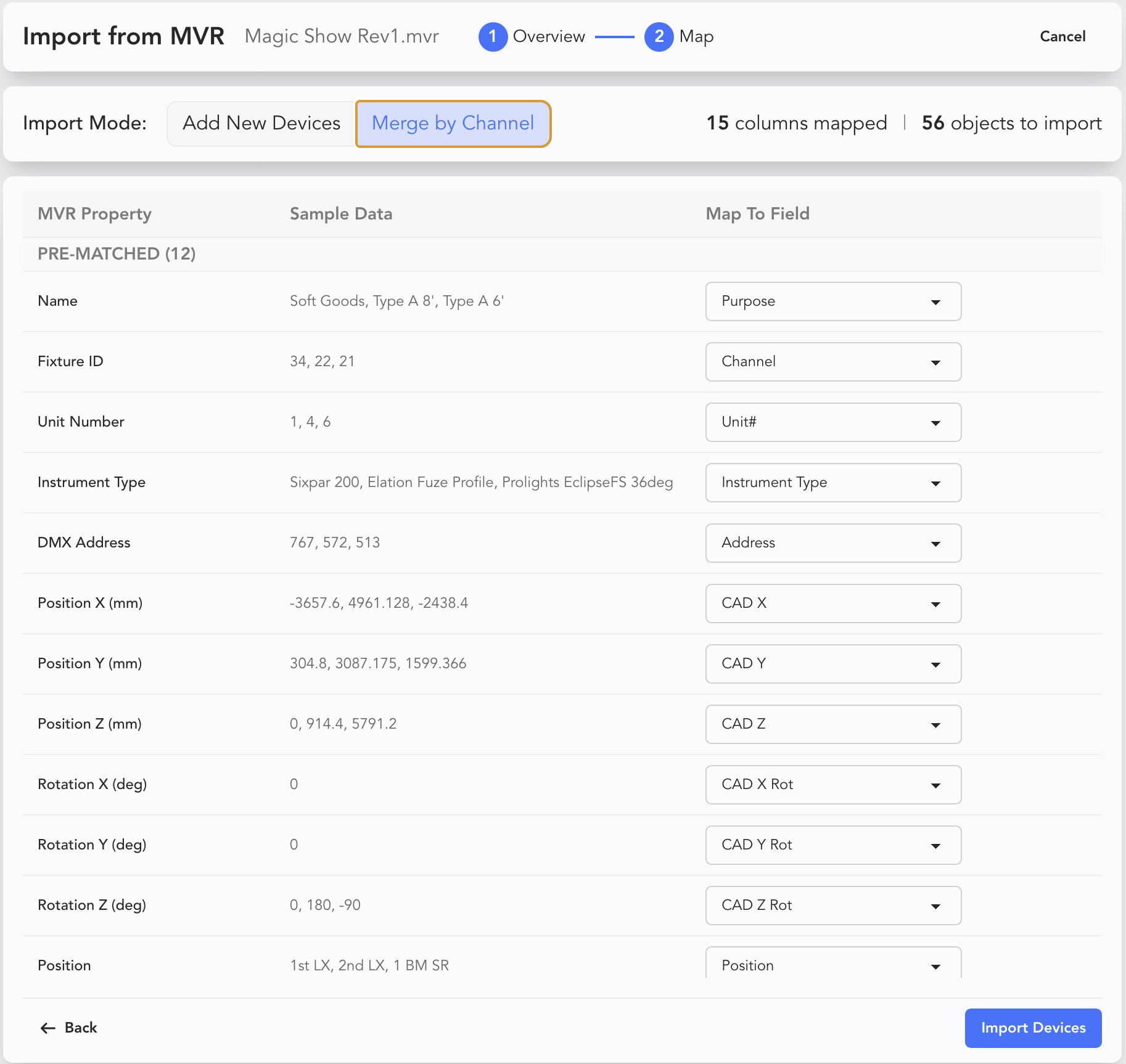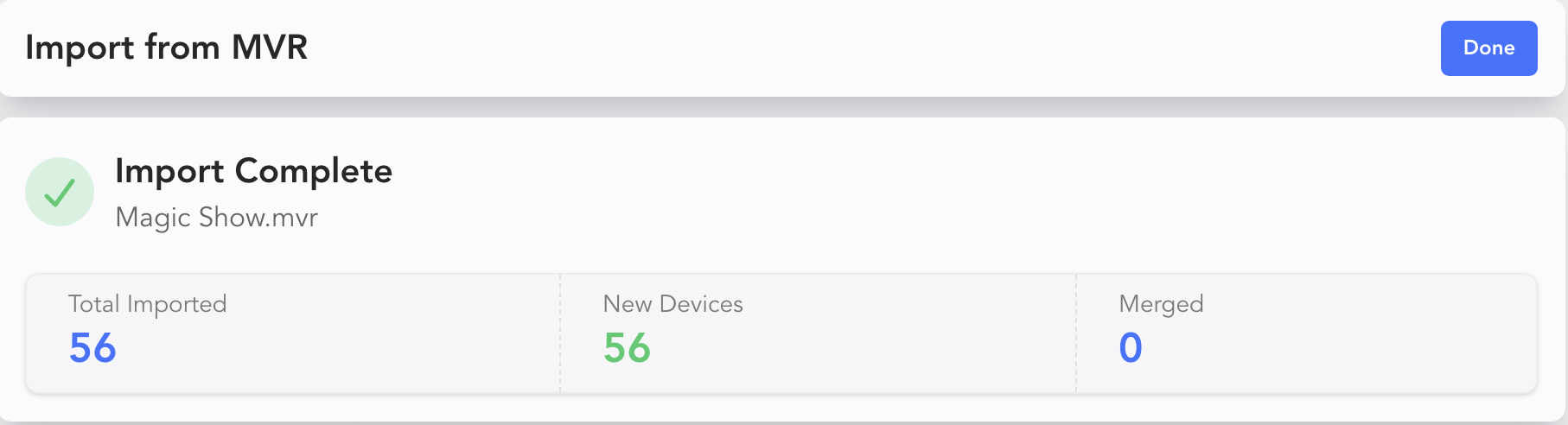 Make sure you select Merge by Channel. Double-check the mapping for your import data to the Lightwright fields. When satisfied, touch Import Devices. The Merge report appears.