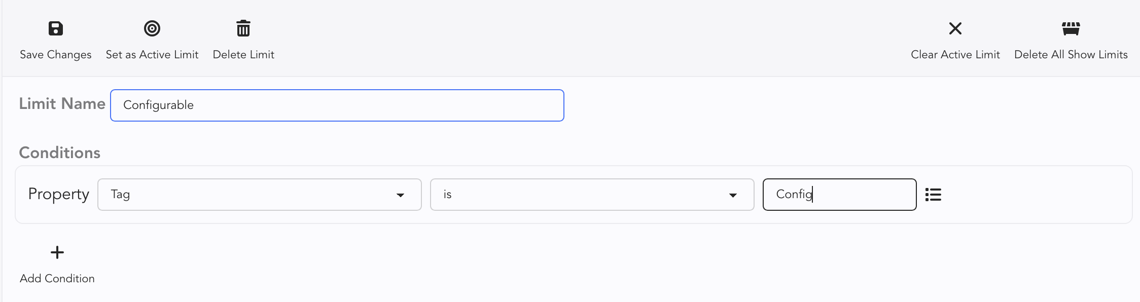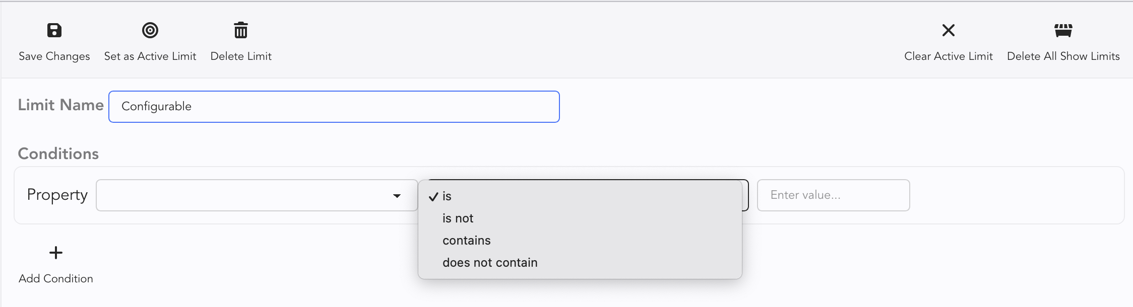 Limits can be created and stored in two places-- the Show (Show Limits) and your Library (My Limits).