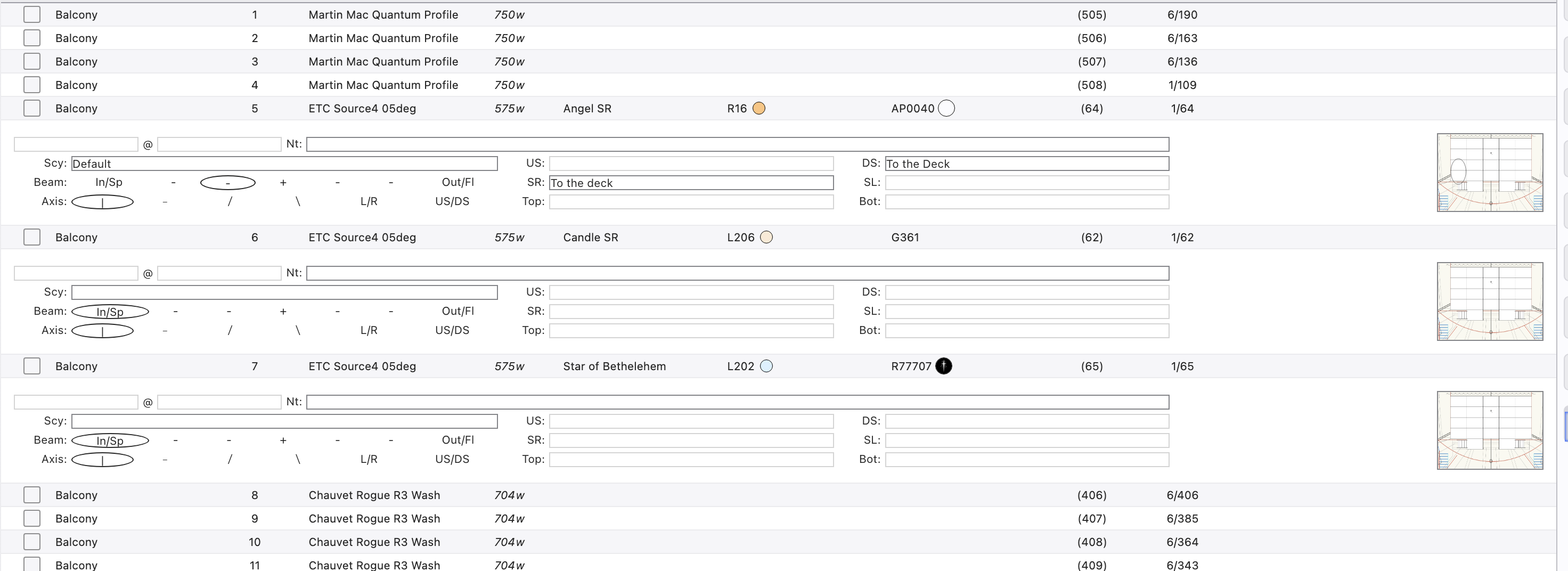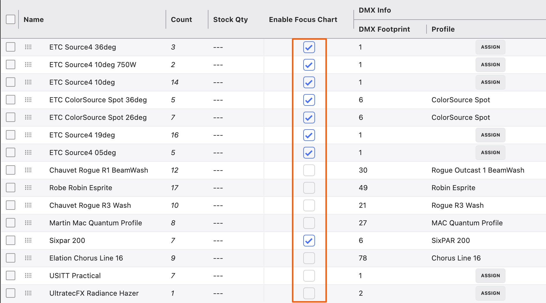 As shown, fixtures that need focusing have Focus Charts attached and those that don't do not.