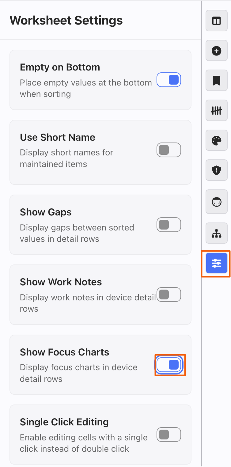 In the Sidepanel, touch the Worksheet Settings and turn on Show Focus Charts.