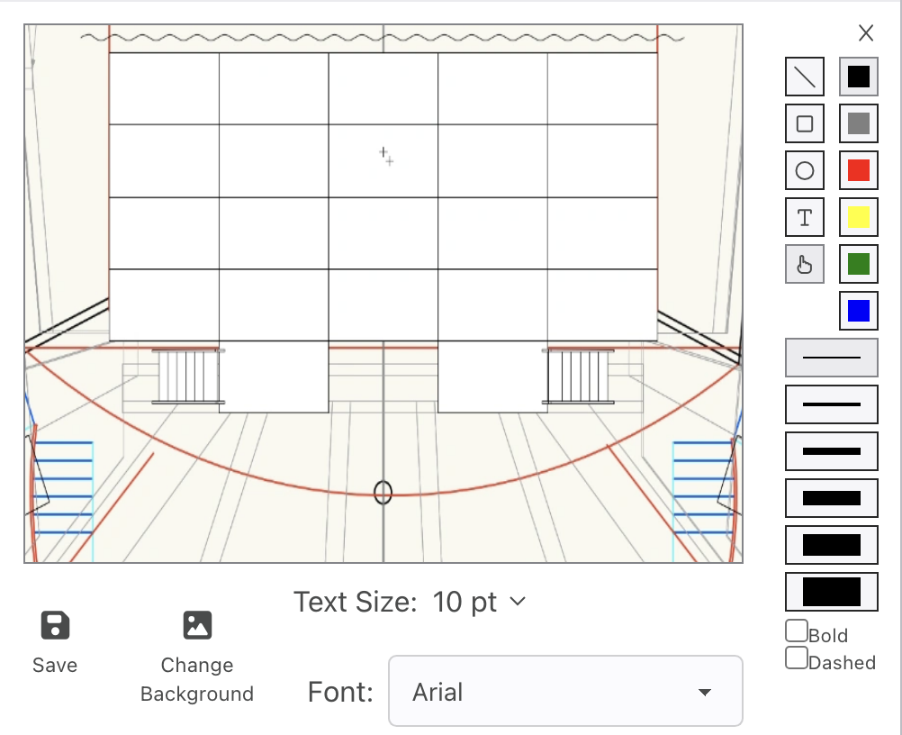 Drawing tools including shapes, color, line width and Bold or Dashed options are on the Right. Font and the option to change your background image and Save are along the bottom.